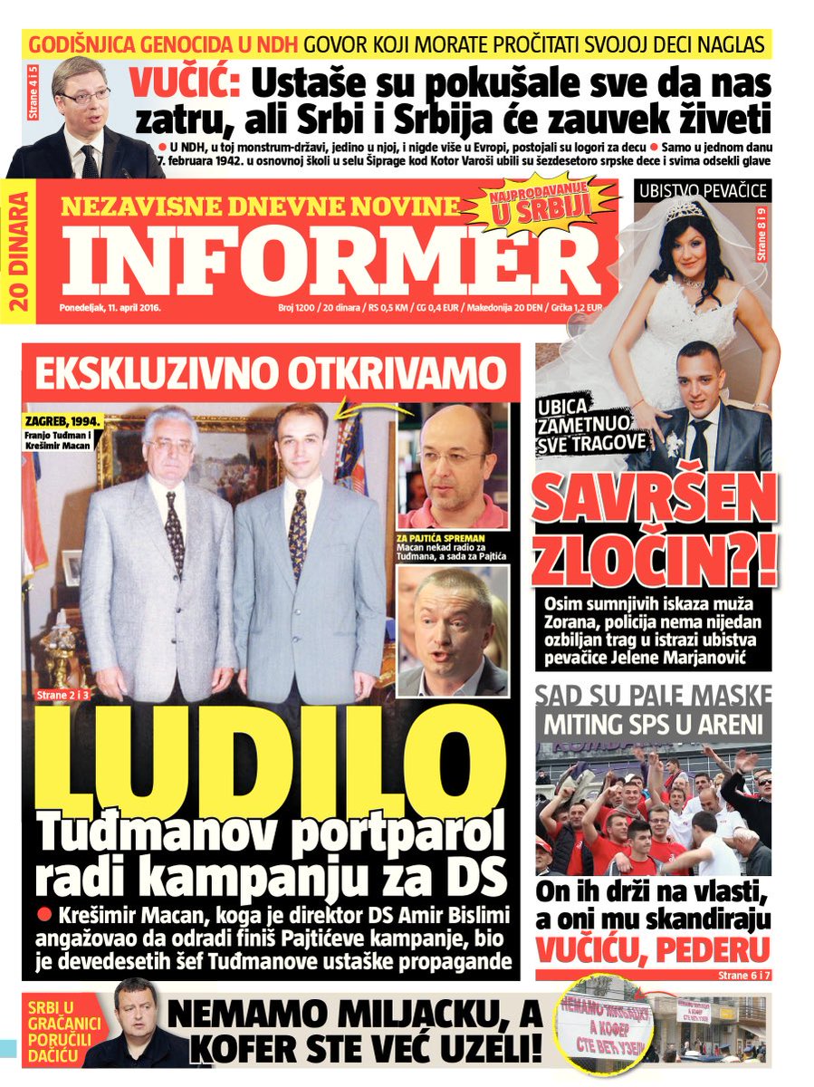 Дневни лист Информер, чији је уредник Драган Ј. Вучићевић, већ је објавио чланак у којем оптужује ДСС и Двери да признају независност Косова и све то чак ставио на насловну страну сутрашњег издања.